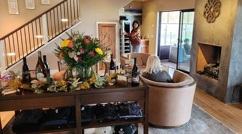 Beyond the vineyard, we encountered a large factory-like building and then, just beyond it, a rambling ranch house. On entering, we found an empty tasting room, with one group of people sitting on the patio. Squeeze us in, indeed! Nonetheless, we were welcomed warmly and were seated in front of a fireplace (no fire) in a living room setting. In fact, that typified our visit to Benovia; it’s like visiting friends with a nice house and good taste in wine.