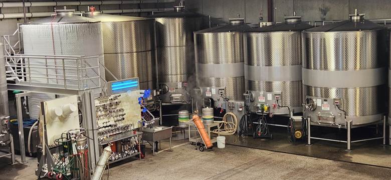 On entering their facility, one sees a large, open room with gleaming steel tanks and a variety of other equipment. There is also a ceramic aging tank that they’re very proud of. The barrel room, like the entire facility, is spotless. For educational purposes, there’s one barrel with a glass head, to allow visitors to see their Chardonnay resting on the lies, which they periodically shake up to maximize the contact with the wine.